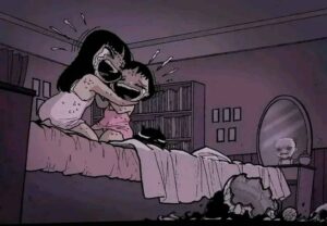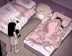 Slowly the doll starts moving on its own. It crawls across the ceiling at night, watches the girl sleep, and begins tormenting her. The once-sweet child becomes terrified, but her older sister (or mother, depending on interpretation) refuses to believe her and keeps forcing her to keep the doll, thinking it’s just an imaginary friend phase.