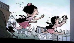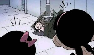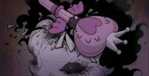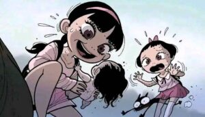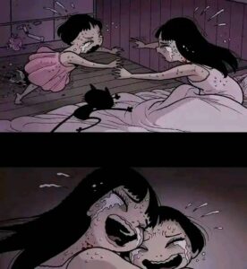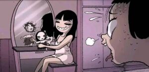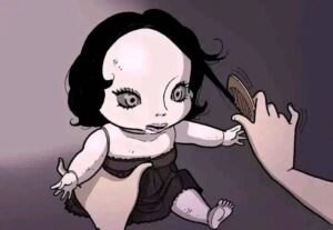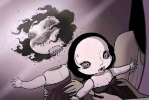Eventually the spirit fully awakens. The doll’s head cracks open, revealing a grotesque, screaming face underneath the cute porcelain. It possesses or completely overpowers the girl who owned it. In the final pages we see the “new” girl happily playing with her little sister again, except now she has the same vacant doll-like eyes and cracked smile. The last panel shows the original girl’s broken body hidden under the bed or in the trash, replaced forever.