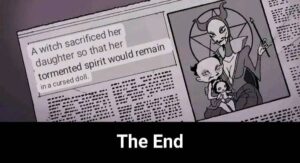 The closing newspaper clipping confirms the backstory: a witch once sacrificed her own daughter to create an eternal plaything, dooming the child’s spirit to possess whoever bonds with the doll next. The cycle simply continues with a new family.