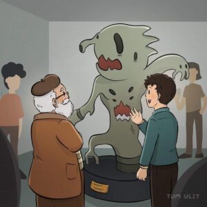 Years later we see the same boy, now grown, having his own child-self’s monster sculptures exhibited in a prestigious gallery.