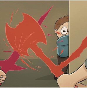 Behind closed doors we see him screaming at his own partner with the exact same red rage-axe, the same 24/7 anger icons floating around it.