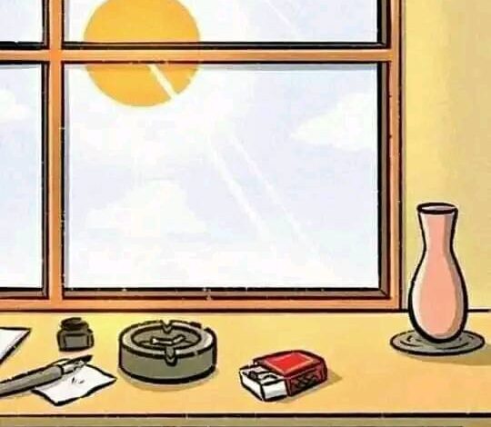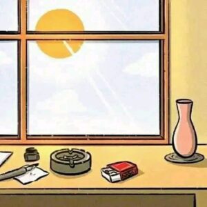 1. We see a windowsill during the day. On it sits an empty flower vase, a box of matches, an ashtray, and some writing tools. The sun is shining.