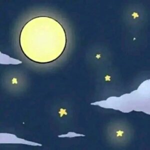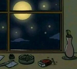 2. At night, the moon is out. A tiny matchstick figure (with a red head) climbs out of the matchbox and lights himself to give light to the vase.