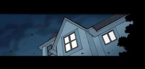 - The dark house at night with lit windows: The family’s house after the ghost has killed them all.