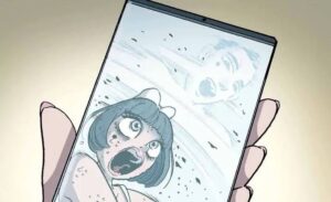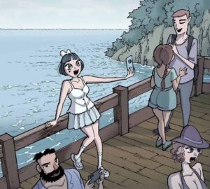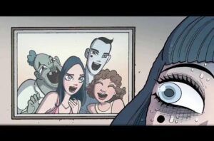 The story is about a young woman (the girl with the white bow and bob haircut) who is revealed to be a vengeful ghost. She has been dead for years, but no one notices because she keeps inserting herself into people’s lives and photos, desperately trying to feel alive and part of a happy family/friend group.