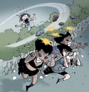 - People’s terrified reactions (running away, screaming, rocks being thrown, etc.): They can sense something is horribly wrong with her (she’s ice-cold, smells of death, brings freezing wind, etc.), even if they can’t see she’s a ghost yet.