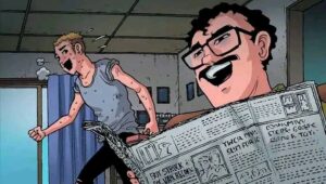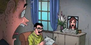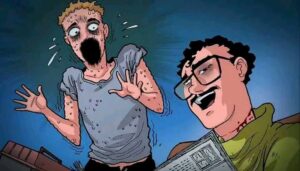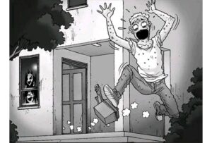 15–20. In the “alternative” ending, the plumber keeps trying to escape, but the husband calmly keeps blocking him, still reading the newspaper. Eventually the corpse reanimates into a full-on zombie/ghost and drags the screaming plumber back inside while the husband just smirks behind his paper.