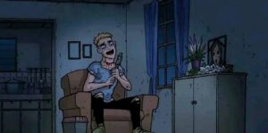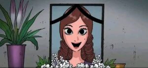 He discovers the woman is actually dead. She’s been dead for a while (rigor mortis, corpse-pale, eyes rolled back). There’s a memorial photo of her on the table with flowers and candles.