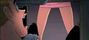 4–6. Classic porn setup: woman stands over him in a short skirt with no panties, he looks up and gets the “lucky” view. He’s shocked and excited.
