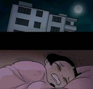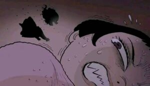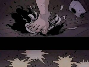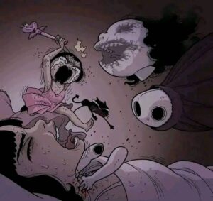 Eventually the spirit fully awakens. The doll’s head cracks open, revealing a grotesque, screaming face underneath the cute porcelain. It possesses or completely overpowers the girl who owned it. In the final pages we see the “new” girl happily playing with her little sister again, except now she has the same vacant doll-like eyes and cracked smile. The last panel shows the original girl’s broken body hidden under the bed or in the trash, replaced forever.